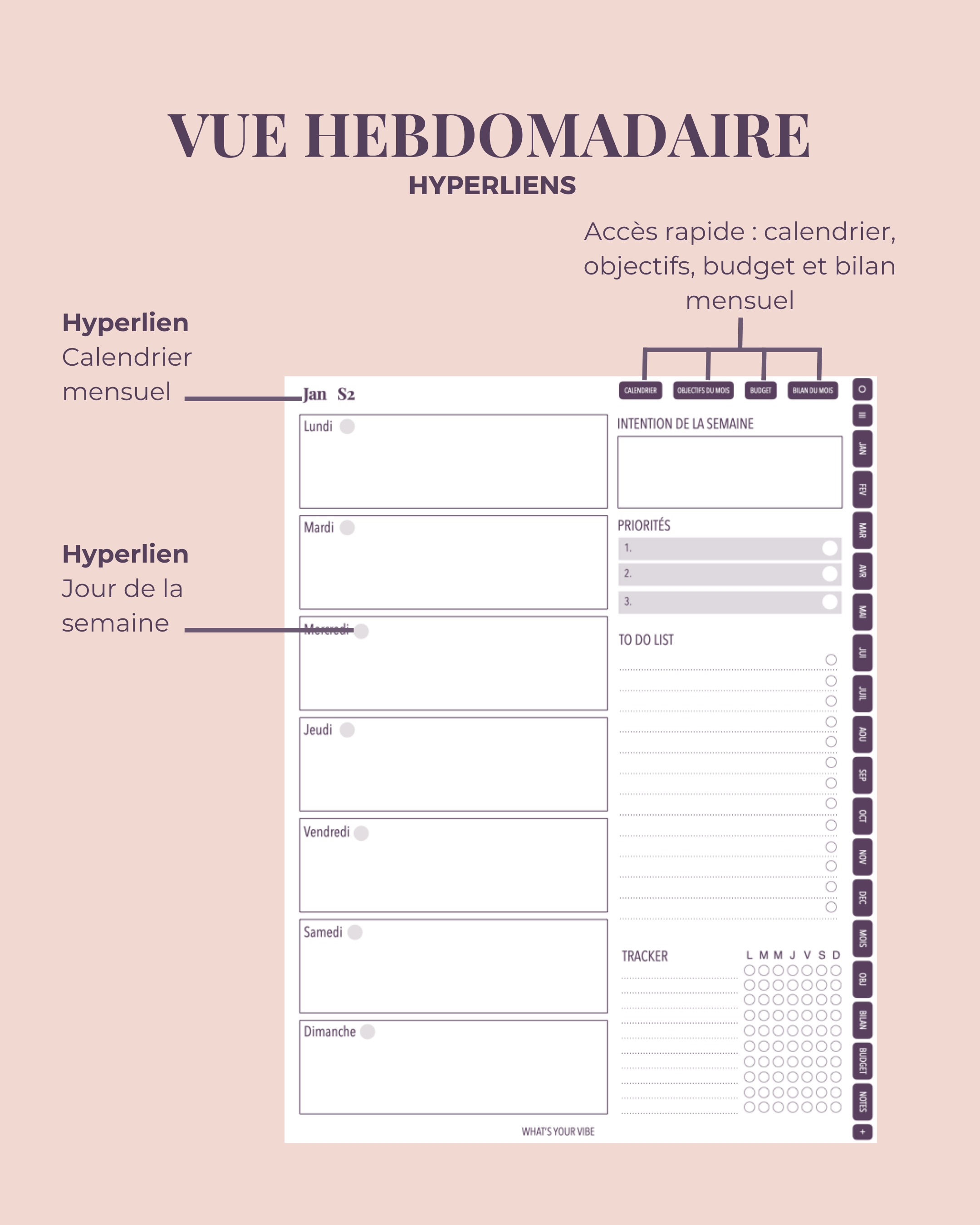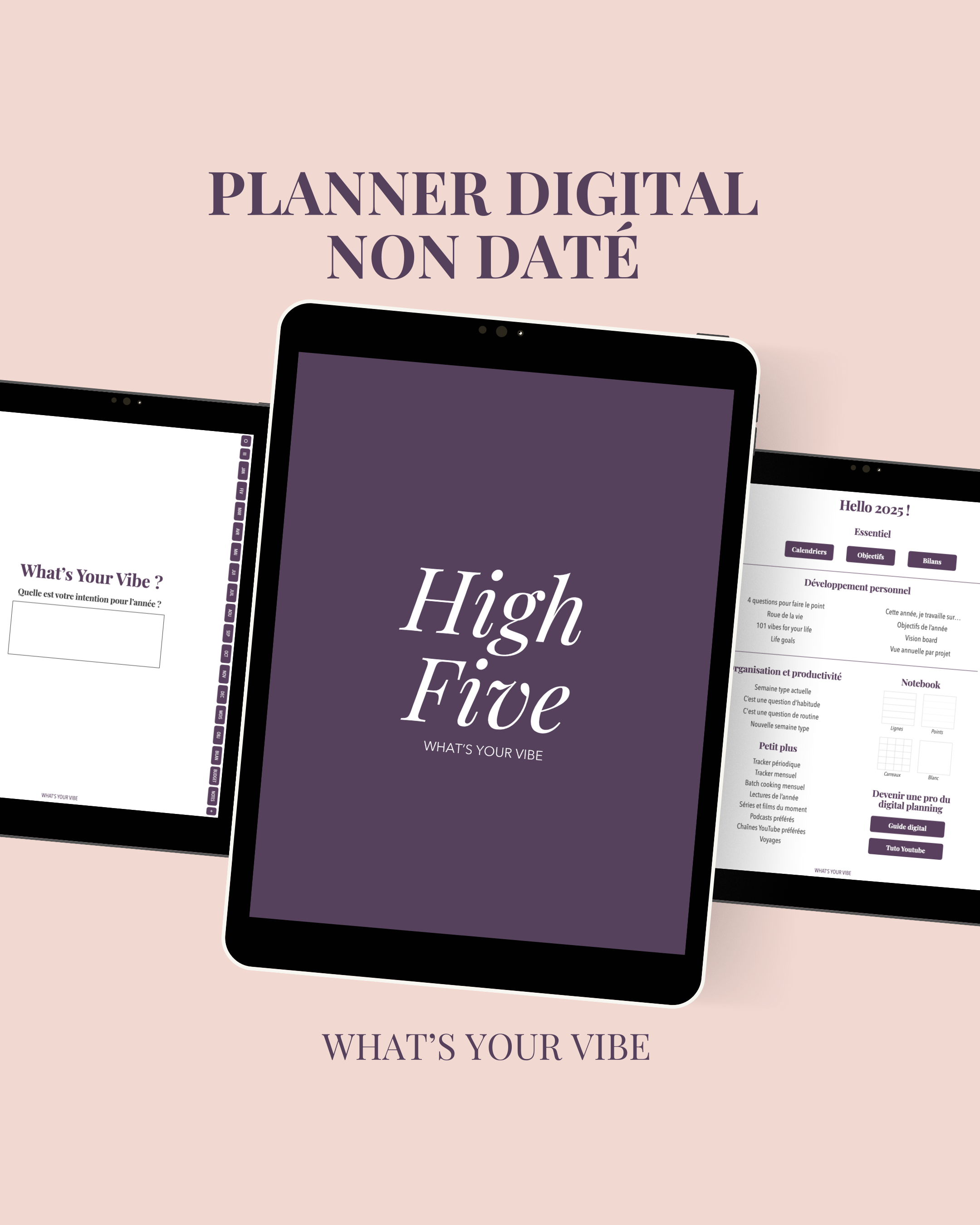 Catégories : Tous Bundles Planners Journaux & carnets Notebooks Stickers Cartes cadeaux Boutique Tous Bundles Planners Journaux & carnets Notebooks Stickers Cartes cadeaux Bundle Exceptional - Planner daté + Workbook + Journal Prix promotionnel : 30,00 € Prix initial : 45,00 € Promotion Ajouter au panier Ajout effectué ! Bundle Essential - Planner daté + Workbook Prix promotionnel : 20,00 € Prix initial : 35,00 € Promotion Ajouter au panier Ajout effectué ! Planner Digital Daté - High Five For 2025 Prix promotionnel : 15,00 € Prix initial : 25,00 € Promotion Ajouter au panier Ajout effectué ! Planner Digital NON Daté - High Five Prix promotionnel : 15,00 € Prix initial : 20,00 € Promotion Ajouter au panier Ajout effectué ! Planner Digital Daté - High Five For 2025 - Sans Thématiques Prix promotionnel : 10,00 € Prix initial : 20,00 € Promotion Ajouter au panier Ajout effectué ! Workbook de développement personnel - High Five The Workbook Prix promotionnel : 10,00 € Prix initial : 15,00 € Promotion Ajouter au panier Ajout effectué ! Journal de Gratitude et de Journaling - Gratitude X Journaling = Vibes Prix promotionnel : 10,00 € Prix initial : 15,00 € Promotion Ajouter au panier Ajout effectué ! Notebook - Projects Book - 10 catégories - Violet 5,00 € Ajouter au panier Ajout effectué ! Notebook - Projects Book - 5 catégories - Violet 2,50 € Ajouter au panier Ajout effectué ! Stickers digitaux - Stickers numériques - Violet 2,50 € Ajouter au panier Ajout effectué ! Cartes Cadeaux What's Your Vibe À partir de 25,00 € Sélectionner une valeur 25,00 € 35,00 € 45,00 € Ajouter au panier Ajout effectué ! Votre newsletter hebdomadaire spéciale good vibes. On parle organisation, productivité, mindset, bien-être. Bref tout ce qu'il vous faut pour optimiser votre vie afin de mieux en profiter. Prénom Nom de famille Adresse e-mail S'abonner Nous respectons votre vie privée. Oh yes, vous êtres bien inscrite. À très vite dans votre boite mail.